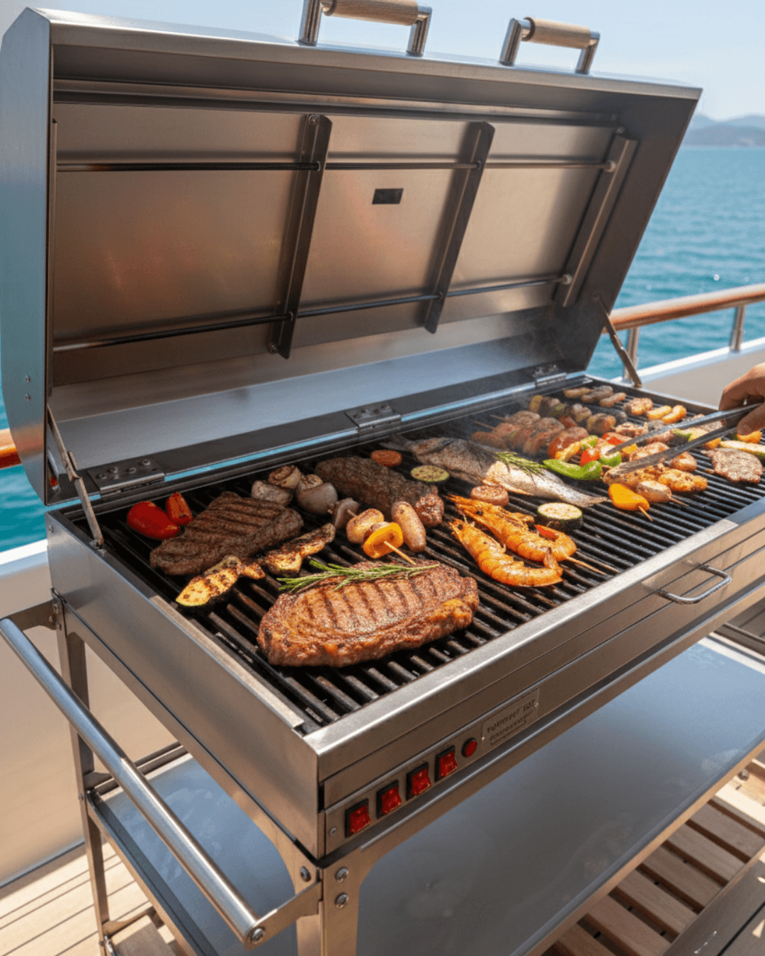 La parrilla eléctrica más grande del mercado, diseñada específicamente para uso intensivo en embarcaciones y espacios exteriores. Construida íntegramente en acero inoxidable 304, con un espesor de 1.5 mm, garantiza máxima durabilidad, resistencia a la corrosión y una cocción sin humo.